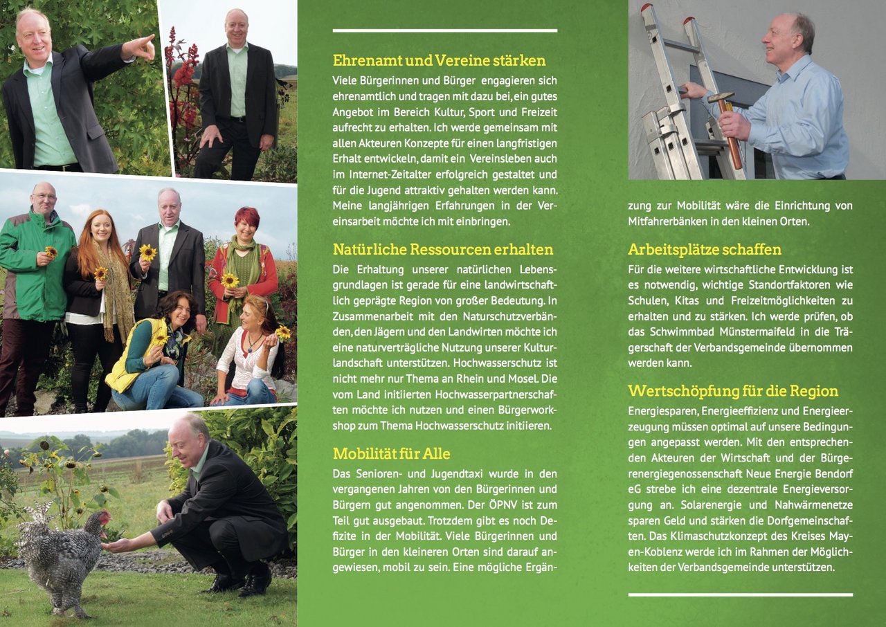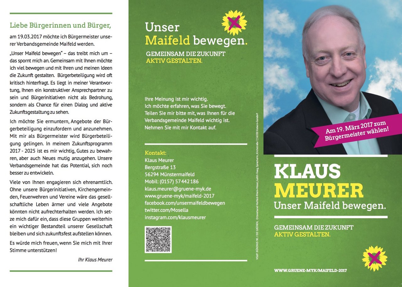 Die Maifelder Bürgerinnen und Bürger sind am Donnerstag, den 16. Februar um 19:00 Uhr herzlich eingeladen, in Ochtendung im Hotel Arosa, Koblenzer Str. 2, an der öffentlichen Fraktionssitzung BÜNDNIS 90/DIE GRÜNEN im Verbandsgemeinderat Maifeld teilzunehmen. Im Rahmen dieser Sitzung steht der Bürgermeisterkandidat Klaus Meurer gerne persönlich Rede und Antwort. Neben seinem Mandat in Kreistag, als Mitglied und Geschäftsführer der GRÜNEN- Fraktion, ist Meurer seit 2014 auch stellvertretender Fraktionsvorsitzender in der GRÜNEN-Fraktion Maifeld, sowie Mitglied im Verwaltungsrat der Kreissparkasse Mayen und in der Planungsgemeinschaft Mittelrhein-Westerwald. Nun wirft er seinen Hut in den Ring zur Wahl des Verbandsgemeindebürgermeisters am 19. März 2017. Die Fraktionsvorsitzende der GRÜNEN-Fraktion im Maifeld Birgit Meyreis erläutert: “von Anfang an ist uns das bürgerschaftliche Ehrenamt und die Beteiligung der Bürgerinnen und Bürger an den politischen Entscheidungen sehr wichtig. Auch haben wir stets ein Augenmerk auf die kleinen Dinge und Randgruppen, die keine sichtbare Lobby haben. So ist auf Initiative der Maifeld-Grünen das Schulschwimmen für alle Grundschüler im Maifeld möglich geworden. Der Frauennotruf Koblenz, auch für das Maifeld zuständig und auch von Maifelder Frauen genutzt, wird nun von unserer Verbandsgemeinde mit einem kleinen Beitrag mitfinanziert. Ebenso haben wir mit Erfolg die Ehrenamtskarte eingebracht. Ich freue mich sehr, dass mein Fraktionskollege Klaus Meurer nun gegen den Amtsinhaber Maximilian Mumm kandidiert. Am 19. März 2016 wird der neue Verbandsgemeindebürgermeister für das Maifeld gewählt und Sie haben die Wahl!“ Kontakt: vg-rat-maifeld@gruene-myk.de Infos: www.gruene-myk.de/maifeld-2017 und facebook.com/unsermaifeldbewegen