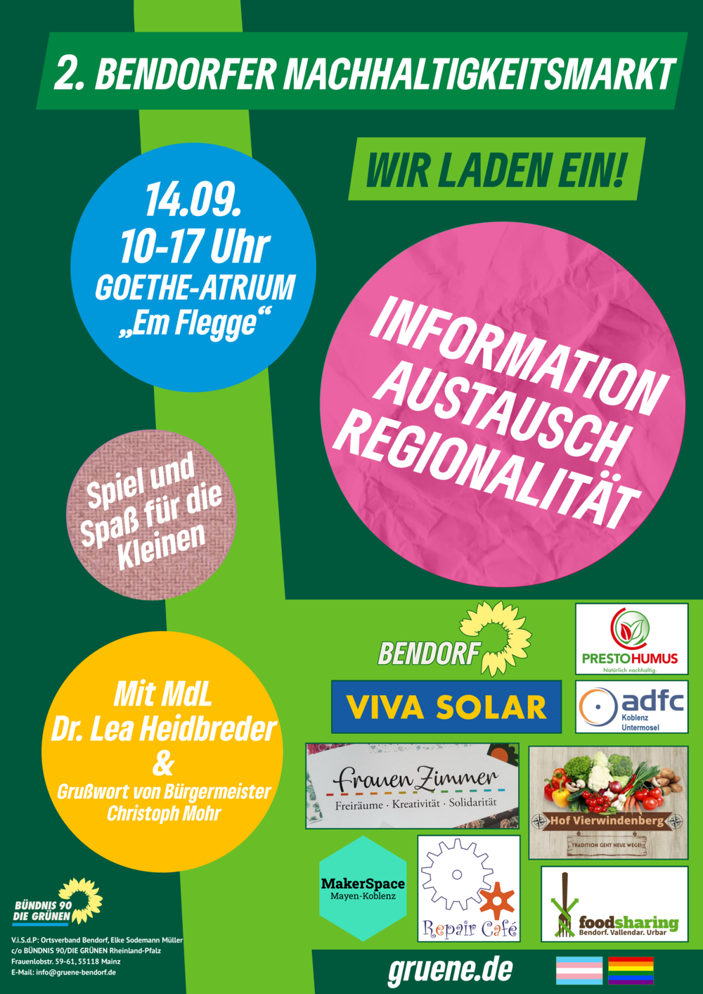 Einen fröhlichen und bunten Tag wollen die Bendorfer Grünen ihren großen und kleinen Mitbürgern an diesem Samstag bieten. Im Sinne der Nachhaltigkeit werden vor allem Produkte, Ideen und Informationen örtlicher und regionaler Akteure angeboten. Viele Stände warten mit zahlreichen Informationen, Anregungen und Angeboten auf die Besucher.