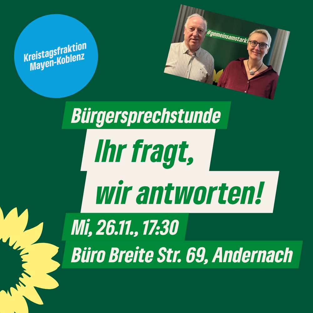 Die Kreistagsfraktion von BÜNDNIS 90/DIE GRÜNEN bietet im November wieder eine Sprechstunde im Büro in Andernach an. Interessierte Bürgerinnen und Bürger des Landkreises Mayen-Koblenz haben die Möglichkeit, Fragen zu stellen und sich zu politischen Themen mit der grünen Kreistagsfraktion auszutauschen.