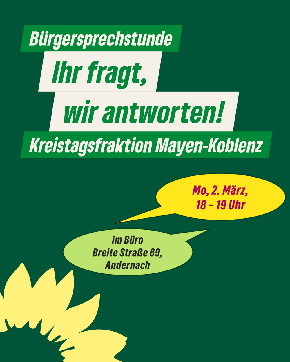 Die Kreistagsfraktion von BÜNDNIS 90/DIE GRÜNEN bietet wieder eine Sprechstunde im Büro in Andernach an. Interessierte Bürgerinnen und Bürger des Landkreises Mayen-Koblenz haben die Möglichkeit, Fragen zu stellen und sich zu politischen Themen mit der grünen Kreistagsfraktion auszutauschen.