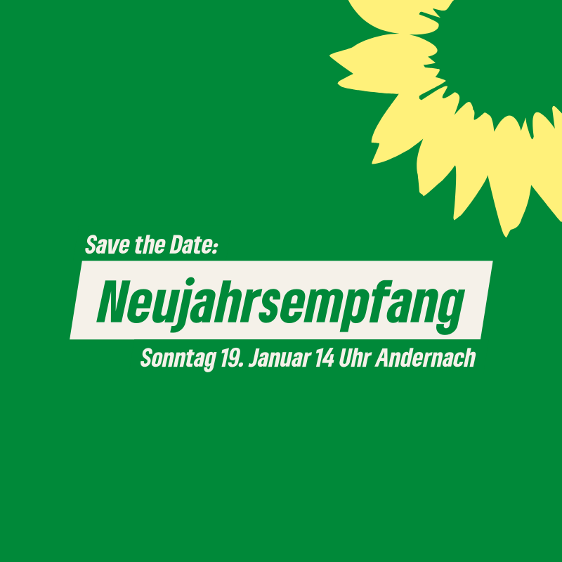 Die Mayen-Koblenzer Grünen laden herzlich ein zum Neujahrsempfang am 19. Januar um 14 Uhr in die Andernacher Mittelrheinhalle.