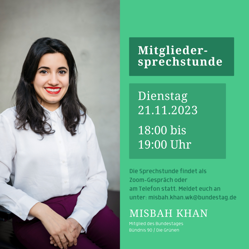 Am 21.11. von 18:00 bis 19:00 bietet unserer Bundestagsabgeordnete Misbah Khan wieder eine Mitgliedersprechstunde an.