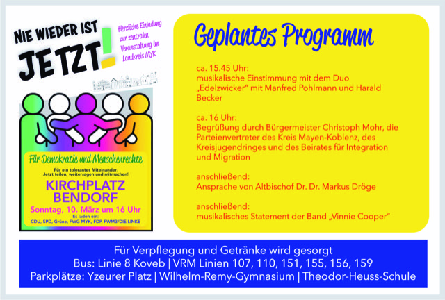 Alle im Kreistag MYK vertretenen Parteien (CDU, SPD, Grüne, FWG Myk, FDP, FWM3/ DIE LINKE), außer der AfD, haben sich zu einer zentralen Kundgebung in Bendorf entschlossen. "Nie wieder ist jetzt! Für Demokratie und Menschenrechte“.
