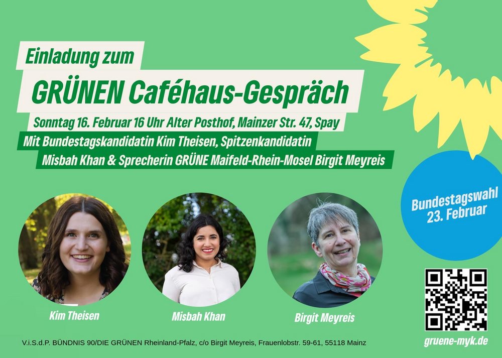 Am 16.2. um 16 Uhr werden die Direktkandidatin Kim Theisen und die rheinland-pfälzische Spitzenkandidatin Misbah Khan sowie die Sprecherin des Ortsverbandes Birgit Meyreis für alle Interessierten ein offenes Ohr haben.