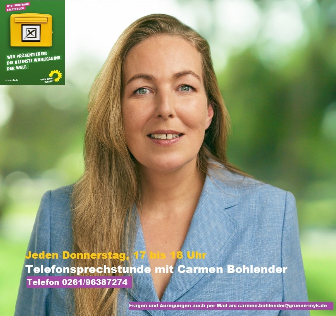 Da die Grünen derzeit auf Veranstaltungen und direkte Gespräche mit den Menschen verzichten müssen, bietet die Landtagskandidatin eine Telefonsprechstunde an, während der sich alle Bürgerinnen und Bürger mit Fragen, Anregungen und Kritik an sie wenden können. Ein Gespräch mit Carmen Bohlender, möglich jeden Donnerstag, ab dem 21.01.2021 zwischen 17.00 und 18.00 Uhr unter der Telefonnummer: 0261/96387274.