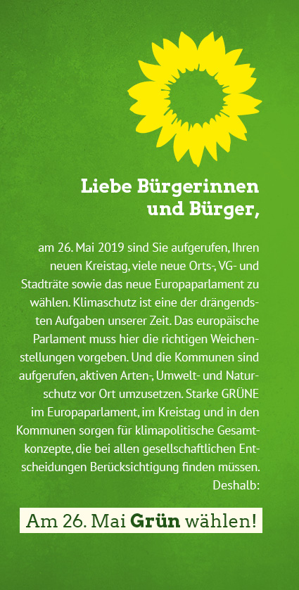 „Für uns stehen Umwelt- und Klimaschutz an erster Stelle. Hier gibt es auf kommunaler Ebene viele Entscheidungen zu treffen, welche langjährige Auswirkungen auf die Menschen bei uns in der Verbandsgemeinde haben“, erklärt Sabine Granzow, Ortsgruppensprecherin Mülheim Kärlich (Listenplatz 1 auf der grünen Liste für die Stadt Mülheim-Kärlich).