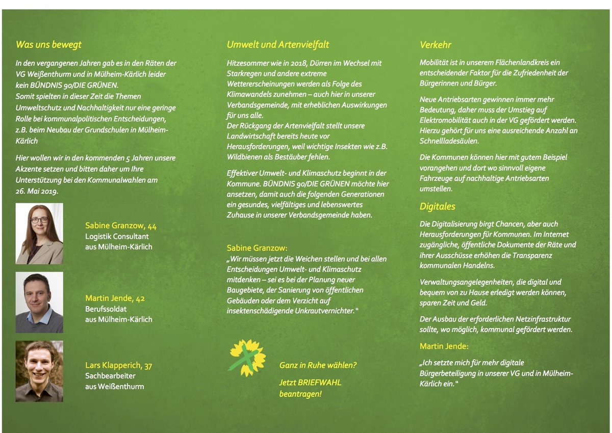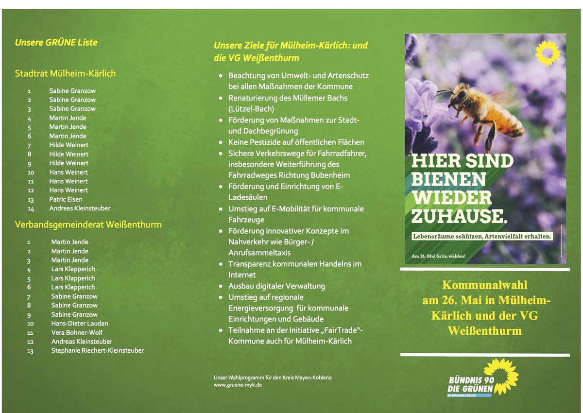 Zum ersten Mal seit vielen Jahren treten sowohl in der Verbandsgemeinde Weißenthurm als auch in der Stadt Mülheim-Kärlich Mitglieder von Bündnis 90/Die Grünen mit eigenen Listen für die Kommunalwahl an. Wo bisher allein CDU, SPD und FWG um Wählerstimmen geworben haben, möchten nun auch die Grünen eigene thematische Akzente setzen.