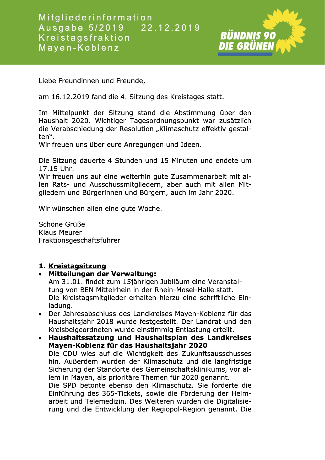 erlauben Sie mir zunächst den Dank unserer Kreistagsfraktion an Sie, Herrn Dr. Saftig, den gesamten Kreisvorstand, und die Mitarbeiter-innen und Mitarbeiter der Kreisverwaltung, sowie der Tochtergesellschaften für den im Jahr 2019 geleisteten Einsatz im Sinne des Landkreises Mayen- Koblenz auszusprechen.